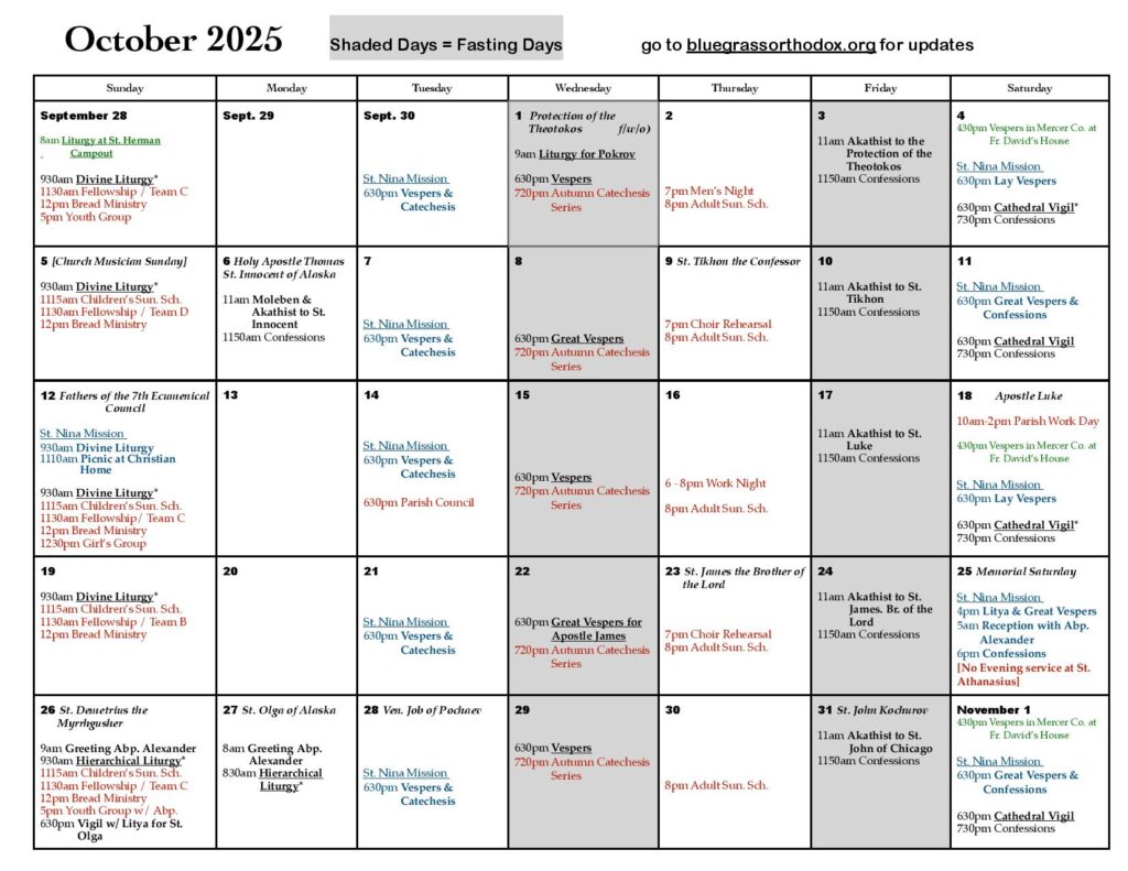 Below is a collection of photos from October 2025, showing the full range of our parish life including both physical improvements at our church and a big annual multi-parish Fall St. Herman Campout (Sept. 26-28) that was held in Corbin, KY. We hope these photos inspire you to visit our church or mission (or one of the local Orthodox parishes.) If you have questions about our calendar or any aspect of our Faith or parish life, please reach out to our associate pastor Fr. Giorgi Lomsadze at fr.giorgi@bluegrassorthodox.org.